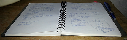 Soll heißen: Ich notiere jeden Gedanken, der mir zum gewünschten Thema in den Sinn kommt. Dummerweise schreibe ich von Hand nicht so schnell, wie ich denken kann. Deshalb kritzle ich die Seiten meines Notizbuchs in dermaßen hässlicher Schrift voll, dass ich sie oft selber nicht mehr lesen kann.